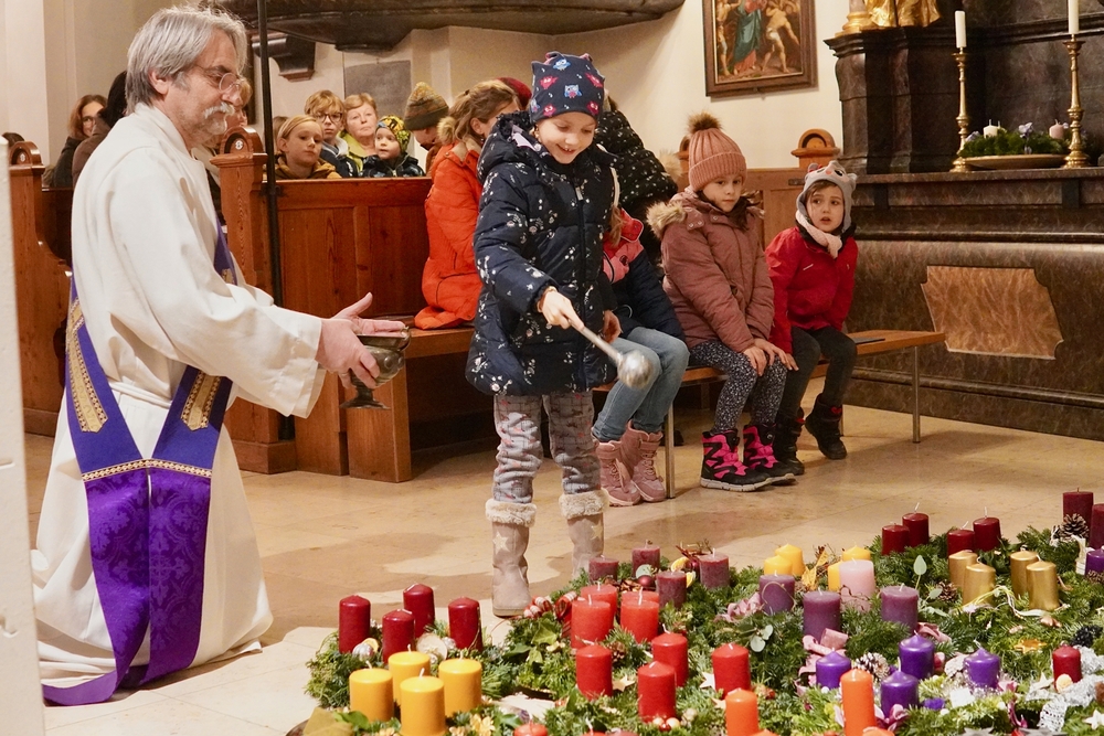 Erstmals durften in der Kirche auch die anwesenden Kinder die Adventkränze segnen, denn … „Segnen darf jede/r, dazu muss man nicht Priester oder Diakon sein!“ So lud Diakon Michi Zepf die Kinder dazu ein - und es machte ihnen sichtlich Freude!